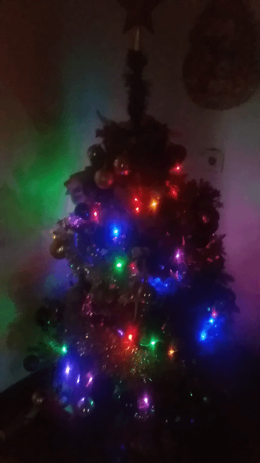 A white cat standing on hind legs reaching for a red Christmas ornament on a tree.