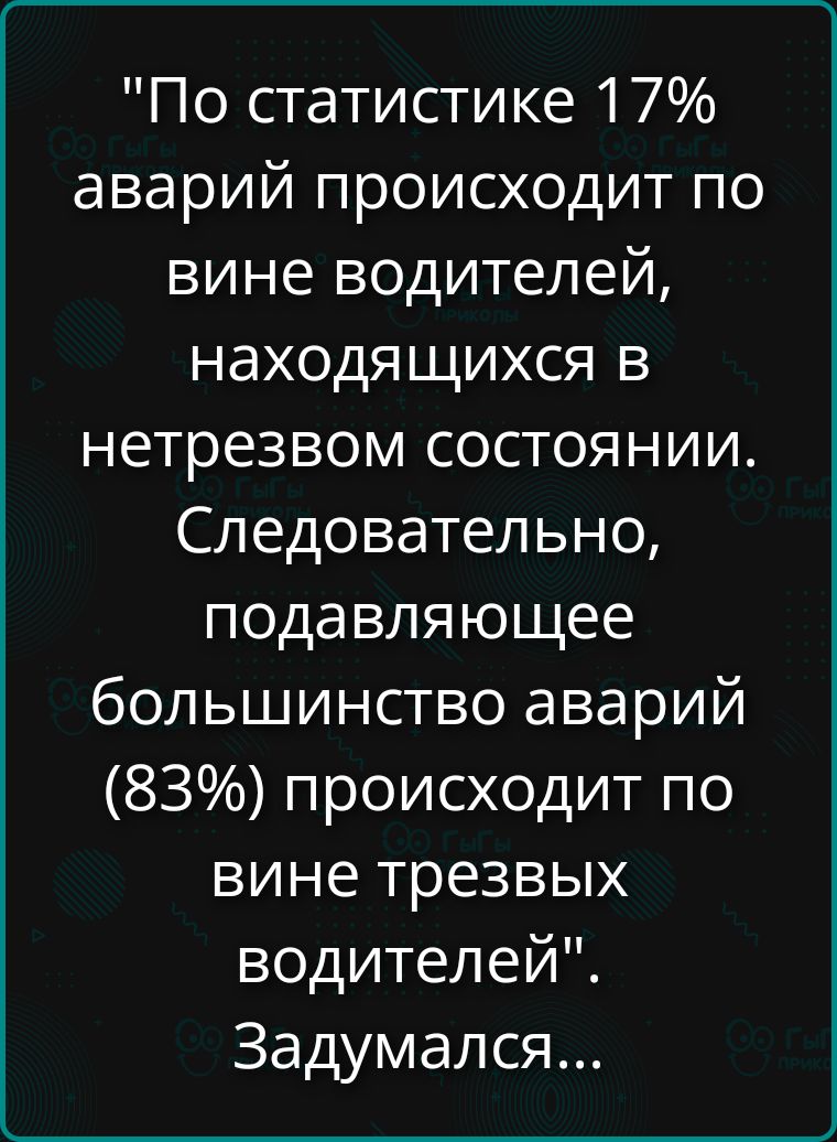 "По статистике 17% аварий происходит по вине водителей, находящихся в нетрезвом состоянии. Следовательно, подавляющее большинство аварий (83%) происходит по вине трезвых водителей". Задумался...