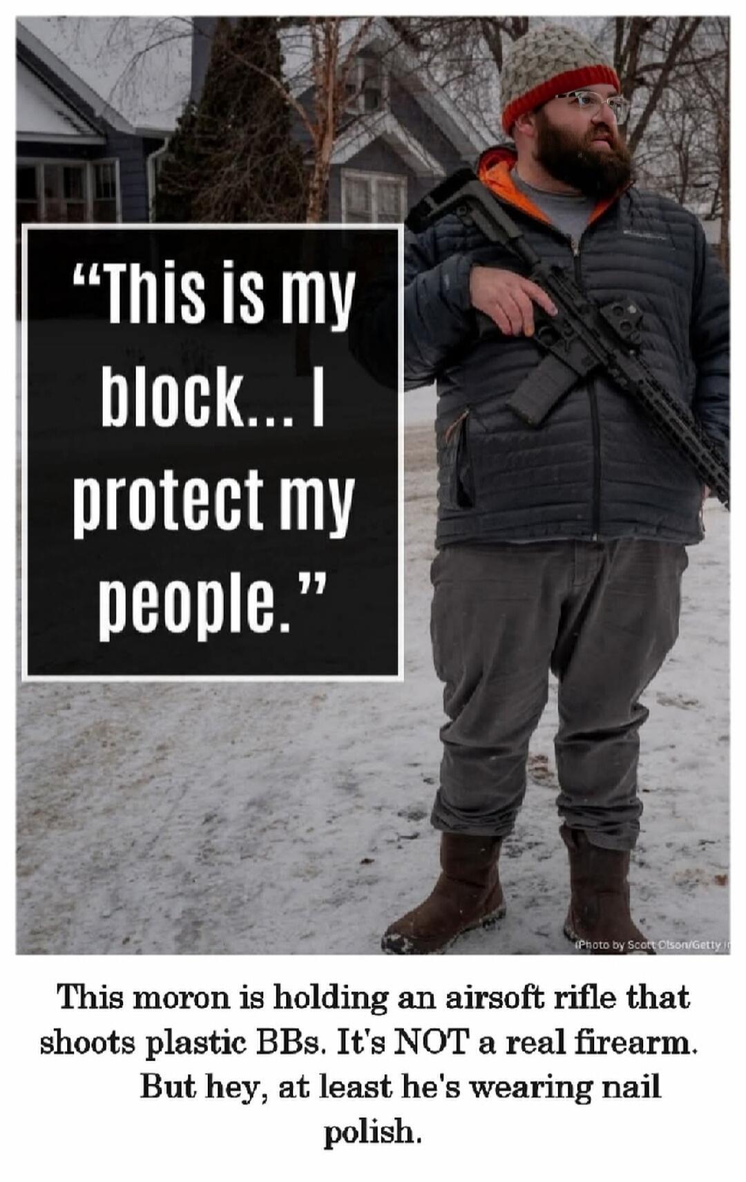 "This is my block... I protect my people." This moron is holding an airsoft rifle that shoots plastic BBs. It's NOT a real firearm. But hey, at least he's wearing nail polish.