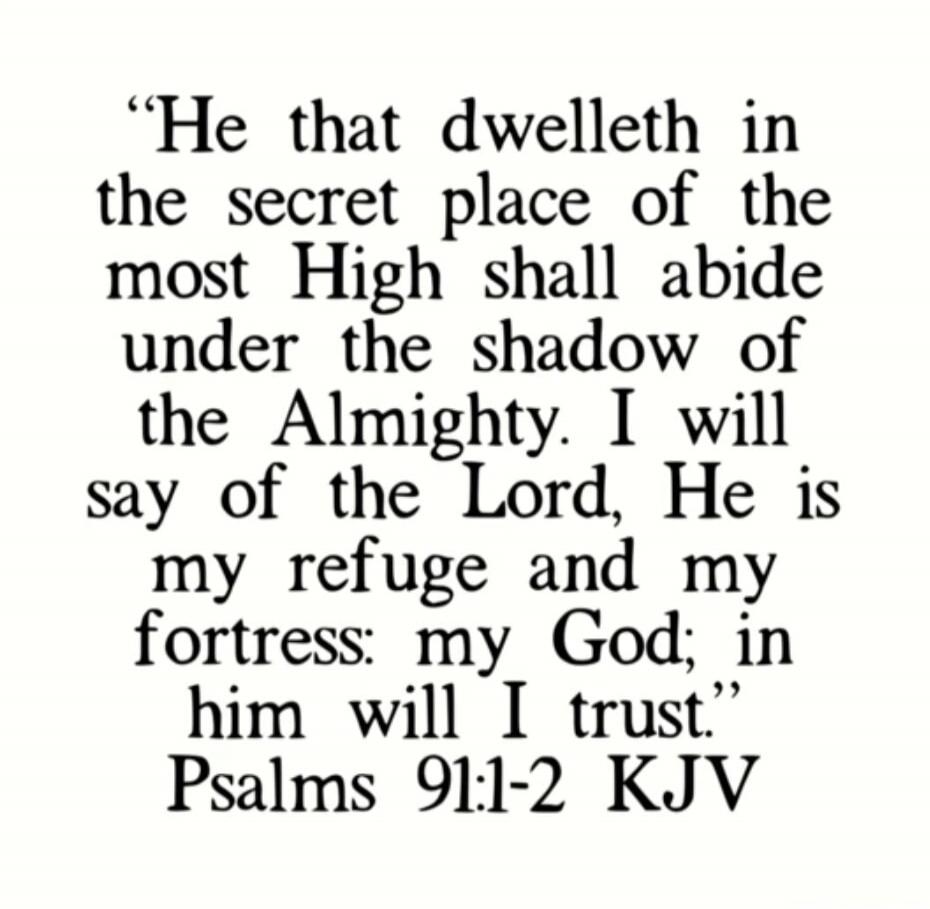 "He that dwelleth in the secret place of the most High shall abide under the shadow of the Almighty. I will say of the Lord, He is my refuge and my fortress: my God; in him will I trust." Psalms 91:1-2 KJV