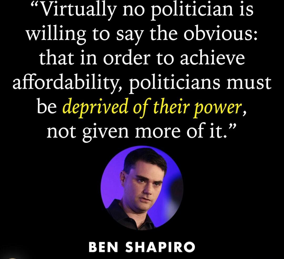 "Virtually no politician is willing to say the obvious: that in order to achieve affordability, politicians must be deprived of their power, not given more of it." Ben Shapiro