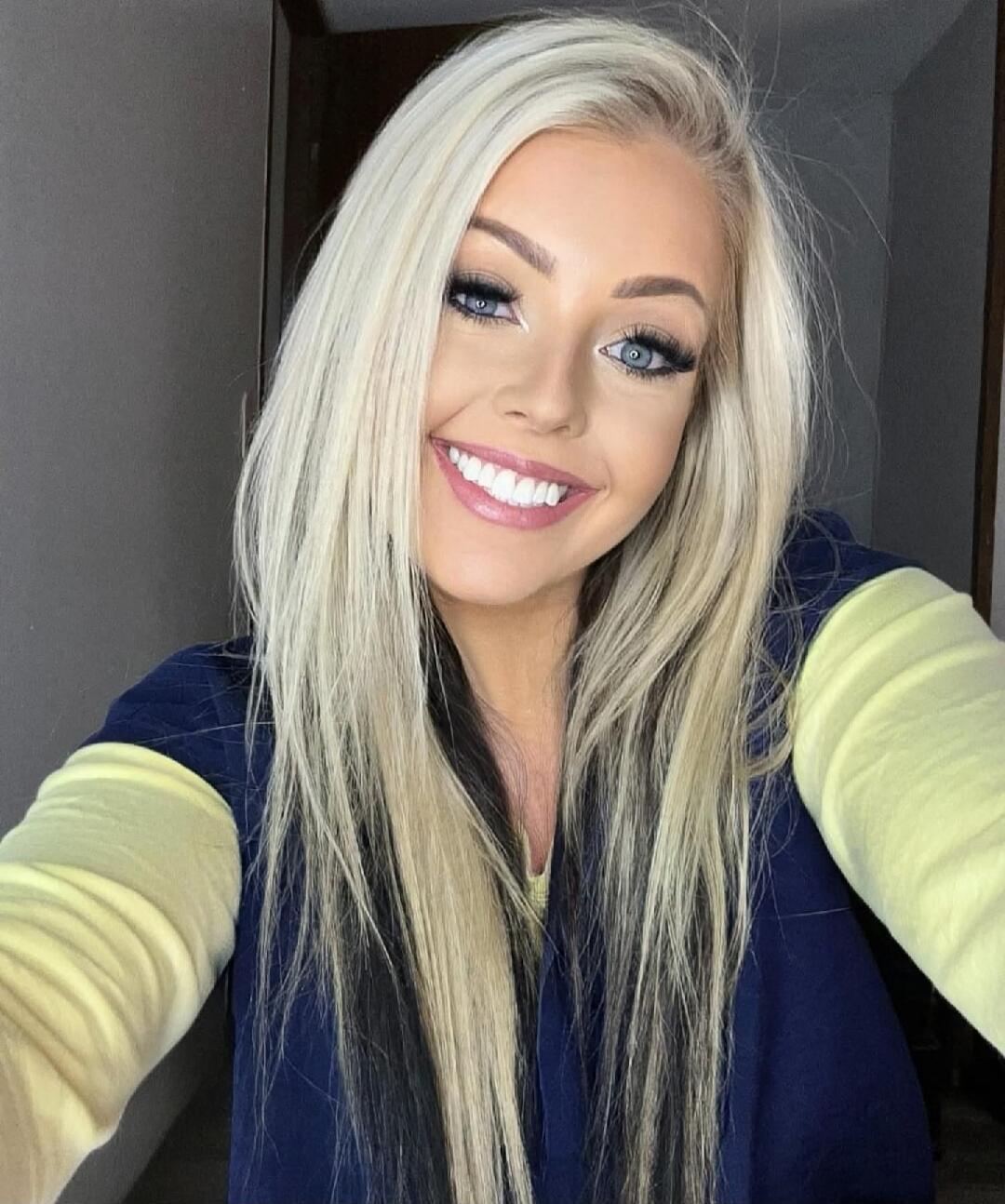 A young woman in a car taking a selfie, making a kissing face. She is wearing a dark blue t-shirt with a golden emblem.
