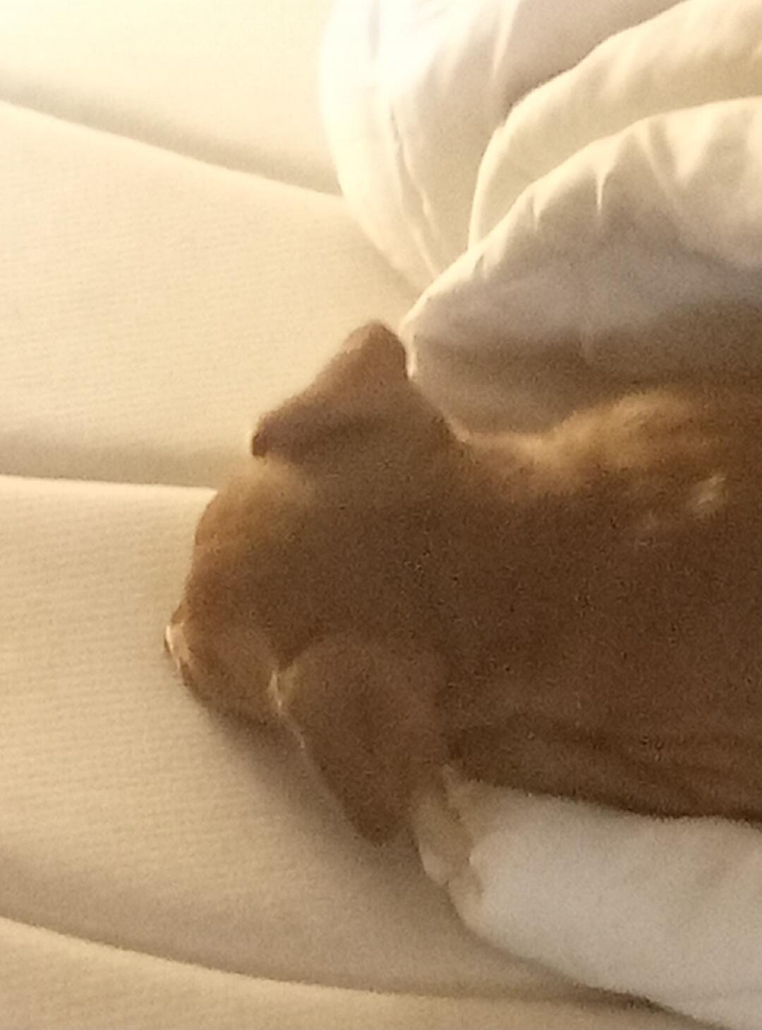 A small white dog, possibly a Maltese, wearing a red puffer jacket with 'Le Mother North Land NAUTIC HOTEL' written on it, is sitting in the passenger seat of a car. The dog is looking towards the camera with its tongue slightly out. The window in the background shows a snowy or frosty landscape.