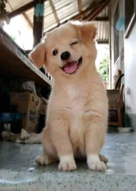 A small brown and white puppy behind a wire fence, surrounded by green leaves.