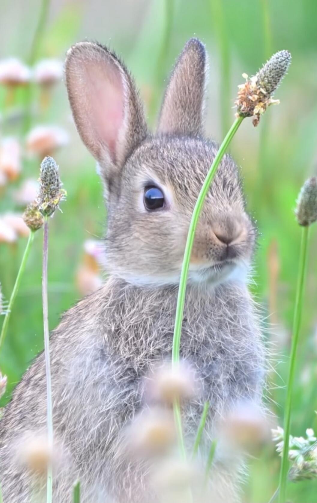 A small brown rabbit in a field of grass with blurred flowers in the background.