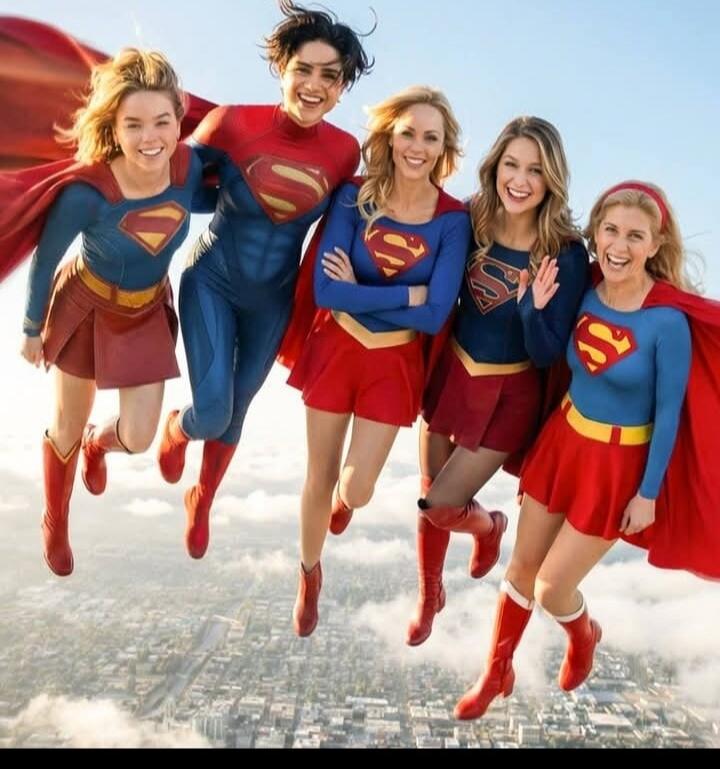 Five people dressed as Superman standing in a row over a city skyline.